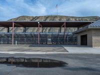 A profile view of a rural landscape in Utah, with asphalt roads and a parking lot casting hard shadows. The majestic mountains create a stunning backdrop against the clear sky, showcasing the beauty of nature in the USA.