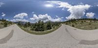 a street view from the perspective angle of an intersection of a road, and on it there is a forest and mountains with clouds