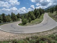 A scenic road in the Pyrenees, Spain, meandering through lush green forests. The asphalt curves and switchbacks, offering breathtaking views of the mountain landscape. An open space with Armco barriers adds a touch of adventure to this European road trip.