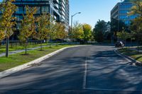 An empty street in Toronto, Canada on a sunny autumn day. Modern architecture and urban design create a cityscape with straight roads and hard shadows. The clear sky frames the scene, highlighting the city's vibrant shopping district.