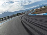 Straight asphalt road curves into the distance under the sunny USA sky at dawn. The race track presents a perfect setting for racing enthusiasts. Sun visible in the sky, promising a day full of sunshine.