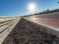 This is an image of a racing track in the USA on a sunny day. The asphalt road curves into the distance, with the clear sky and the sun visible overhead. The race track represents the thrill and excitement of racing. With the sun shining brightly, it creates a sunny and vibrant atmosphere for racing enthusiasts. This photo captures the energy and intensity of a race, showcasing the adrenaline-filled moments on the track.