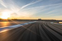 A straight road on a race track in the USA, with asphalt curving ahead. The dawn breaks, illuminating the road with the sun visible. Perfect conditions for racing with clear skies and sunshine.