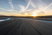 A straight asphalt road stretches into the distance, curving gently towards the sunrise. The sun is visible, casting a warm glow on the race track. Clouds dot the sky on this sunny morning.