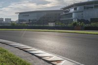 Suzhou race track, surrounded by modern architecture, set against a clear sky. Residential area in the background creates a unique contrast. Race track lined with asphalt, perfect for high-speed racing.