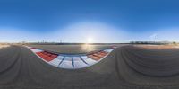 A sunny dawn at a race track in the USA. The straight asphalt road curves into an oval, lined with red and blue tires. The clear sky casts hard shadows as the sun rises.