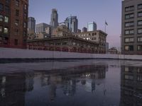 city buildings reflecting in the water on a rainy day with purple skies above them and city streets reflected in wet puddles of water
