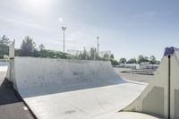 A concrete skateboard park in Toronto, Ontario. The clear sky and visible sun creates ideal conditions for skating and recreational activities. The architectural design of the stadium adds to the appeal of the sport.
