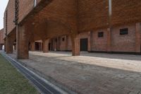 A classic red brick building with arched windows stands in an art district in Shanghai. The brickwork and hard shadows create a striking urban design. Steps lead down to an open grassy area, adding to the charm of city life in China.