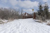 This stock photo features a picturesque winter landscape in Ontario, Canada. In the middle of a snow-covered field, there is a beautiful red bridge surrounded by trees. The image showcases the stunning architecture of the bridge against the backdrop of rural scenery. The snow-covered path and the frost on the trees create a freezing and serene atmosphere. The image captures the charm of suburban living in Canada, with the bridge serving as an important pathway for both pedestrians and vehicles. The cloudy sky adds to the overall beauty of the scene. This stock photo is perfect for showcasing winter landscapes, architecture, and the natural beauty of Ontario, Canada.
