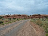 Utah's red rock canyon landscape under a gloomy grey sky. Gravel streets winding through nature's beauty. One-quarter road disappearing into the distance, enhancing the mysterious allure.