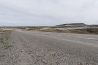 Off-road track in San Rafael Swell, Utah. The lunar landscape road winds through the red rock canyonlands. Low grey sky adds drama to the sandy desert and gravel road.