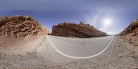A scenic road trip through Utah's desert landscape. The asphalt road winds through red rock canyons and mountain passes, surrounded by grassy slopes. The clear sky and straight road create a captivating profile. An adventure into the heart of Utah's geology.