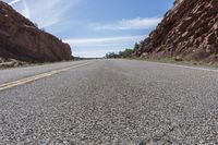 A scenic road trip through the red rock landscape of Utah, USA. The asphalt road winds through desert valleys and canyons, with towering rock walls and clear blue skies overhead. Experience the beauty of nature along this straight road.