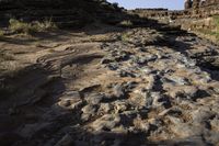 the ground is covered in rocks near a rocky stream on top of the desert terrain