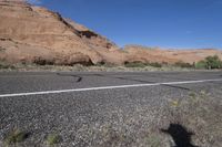 A scenic view of a road winding through the Utah desert. The red rock landscape and towering mountains create a breathtaking backdrop. Clear skies and untouched wilderness make this a perfect day for exploring.