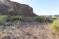 A scenic view of a red rock mountain landscape in Utah at dawn. A dirt road winds through the desert, surrounded by sandy terrain and clear blue skies. The sun is visible, casting a warm glow over the canyonlands.
