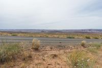 An empty highway cuts through the rugged desert landscape of Utah, surrounded by red rock formations. The grey sky contrasts with the vibrant yellow wildflowers and the grassy plains. A serene day in the natural wilderness of Canyonlands.