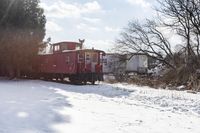 Red Train Car on Snowy Tracks in Ontario, Canada