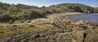 rocks, grass and dirt lining the beach and water that are next to the shore