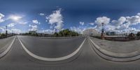 a close up view of the camera and the lens from a street with the road and light posts in front of it