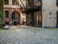 A classic architecture in Berlin's residential area. The brick wall, wooden flooring, and facade give a glimpse of the city's history. The urban design features a courtyard with cobblestone roads, surrounded by modern office buildings. A perfect blend of old and new in Europe's financial district.