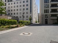A modern high-rise condominium building in Berlin, Germany. The urban design and architecture blend seamlessly with the city life. Cobblestone roads and asphalt road surfaces contribute to the dynamic atmosphere. The residential area features lush grass and vegetation, with outdoor benches lining the streets.