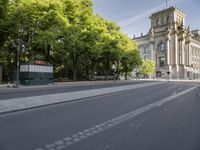 A clear sky frames the classic architecture of Berlin, Germany. The residential area is surrounded by tree-lined roads, creating a picturesque urban landscape. Tourists enjoy the recreational park with its kiosks and Wurst stands.