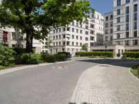 Modern architecture in Berlin, Germany. Clear skies highlight the residential area with cobblestone roads and tree-lined streets. The urban design showcases the unique blend of old and new, making it a perfect representation of city life in Europe.