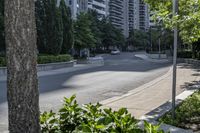 This is an image of a modern residential area in Toronto, Canada. The photo captures the urban design and architecture of the city, with concrete roads and walkways surrounded by manicured grass, trees, and flowers. The neighborhood is a vibrant public space where people can walk along the well-maintained lanes and relax in the gardens. The image showcases the harmonious coexistence of nature and infrastructure in an urban setting. This photo represents the essence of city life in Toronto, Ontario, with its beautiful landscape and botanical elements.