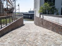 This image showcases the modern architecture and city life in Hamburg, Germany. The straight road leads to a residential area with brick buildings and a clear sky above. The sidewalk is lined with a concrete wall and iron fences on both sides. The brickwork and cobblestone flooring add to the urban design of the public space. This photo captures the essence of Hamburg's urban landscape, combining modern and historic elements. Discover the charm of this European city in Deutschland.