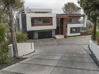 This is an image of a modern mansion in Los Angeles, California, USA. The architecture features a concrete facade and sleek design, reflecting the modern architectural style. The spacious property is surrounded by trees in the backyard, creating a tranquil atmosphere. In the front, the driveway can be seen, with cars parked. This photo represents luxury real estate in a residential area of Los Angeles. It showcases the beauty of modern architecture and the desirable features of a villa. The image captures the essence of a sunny day in California.