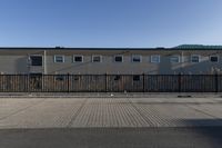 This is an image of a modern office building in Toronto, Canada. The building showcases a low-profile, rectangular design with a facade made of composite materials and large windows. The symmetrical pattern of the facade adds to the urban design of the business district. The surrounding area features a parking lot, road surfaces made of asphalt, and suburban residences. The clear sky above highlights the architectural details of the building. This photo represents a typical day in Toronto's business district.