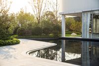 A modern villa in Xian, China with a stunning pool area. The clear sky reflects in the tranquil water, creating a serene ambiance. This suburban oasis offers a glimpse into contemporary Chinese architecture.