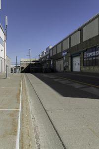 a road and an empty building in a industrial area, showing a wide angle of view
