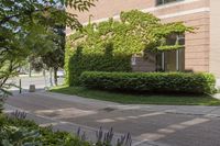 A classic architecture residential area in Toronto. The concrete streets and small roads are lined with trees and shrubs, creating a lush urban oasis. Walkways and driveways connect the properties, while the vibrant green grass and vegetation add to the charm of city life.