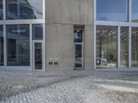 This image captures the modern architecture of an office building in Berlin, Germany. The building features a stylish facade made of composite materials. The large brick sidewalk in front adds to the urban design of the area. In the daytime, the city is bustling with activity, reflecting the vibrant city life of Berlin. The doors of the building are open, inviting visitors to explore the business district. This photo represents the contemporary urban landscape of Europe, showcasing the combination of business, residential, and public spaces.