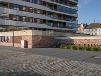A clear sky over Bremerhafen, Germany. The modern architecture of a large residential building dominates the scene, with its brick facade and large windows. The empty brick walkway and urban design create a sense of city life in Europe.