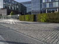 This image captures the modern architecture and cityscape of Berlin, Germany. The photo showcases a residential area with a mix of residential and office buildings. The clear sky highlights the sleek facades and lines of the buildings, while trees and hedges add a touch of greenery to the urban design. The cobblestone road and public spaces create a vibrant city life. This photo represents the dynamic and bustling atmosphere of Berlin, a key business district in Europe.