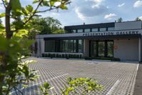 A modern office building in the business district of Toronto, Canada. Windows provide a glimpse into bustling business activity. A parking lot with green bushes and a tree adds a touch of nature to the urban setting.