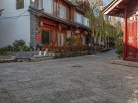 A view of a historic architecture in the old town of Lijiang, China. Cobblestone roads and classic architecture contribute to the charm of this ancient village. Clear sky highlights the beauty of the residential buildings and open spaces.
