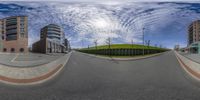 A fisheye lens captures the distorted view of modern architecture in Bremen, Germany. Residential buildings line the street, while a park offers greenery in the city. This urban scene reflects the vibrant city life of Bremen.