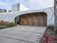 This image captures the futuristic architecture of a residential building in Los Angeles, California. The modern design features a low concrete facade with a unique arch and a roof covered in contrails. The house is located in a suburban area surrounded by trees and urban design. The residential property blends seamlessly with the city life of Los Angeles. The entryway and driveway provide access to the villa, creating a stylish and inviting atmosphere. This photo showcases the emotional connection between architecture and the break of day in California.