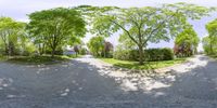 a photo of an empty driveway with a green tree in the middle of it and a stop sign below
