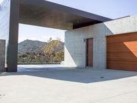 A modern residential home in Los Angeles, California. The house features sleek architecture with clean lines and a concrete surface. Clear skies showcase the electric charging station and carport in the rural setting.