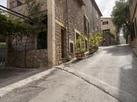 an empty cobblestone road with a stone building and lots of trees and bushes