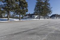This is an image of a clear sky day in a suburban neighborhood in Ontario, Canada. The road, made of asphalt, is lined with residential homes and trees covered in snow. The public space between the houses acts as a land lot for the residents. This image represents the winter season in a residential area, showcasing the real estate and vegetation covered in snow. The residential properties provide a peaceful and picturesque setting in the freezing temperatures of winter.