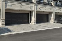 A modern architecture residential property in Ontario, Canada. The facade is made of composite materials with columns lining the road. The automotive exteriors parked in the garage showcase alloy wheels.