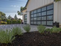 This stock photo features a beautiful residential property located in a peaceful suburban area. The image showcases a plant garden with flowers and plants near a spacious backyard. The garage, which is conveniently situated close to the garden, adds to the overall aesthetic of the property. The lush green grass and vegetation provide a refreshing touch. On a sunny day, the clear sky and clouds create a perfect backdrop for this serene setting. The asphalt road surface and concrete structure complement the residential landscape. The building's architecture is elegant, and the entrance door is visible in the shot. With ample open space and a well-maintained garden, this property offers a perfect blend of nature and comfort.