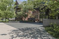This stock photo captures a residential property in Toronto, Canada. The classic architecture of the building, with a lot of windows, adds to the charm of the neighborhood. The image shows an empty driveway leading to the building, surrounded by trees. The urban design and city life can be felt in the vibrant surroundings. The photo represents the beauty of residential areas in Toronto and showcases the real estate opportunities in the city.